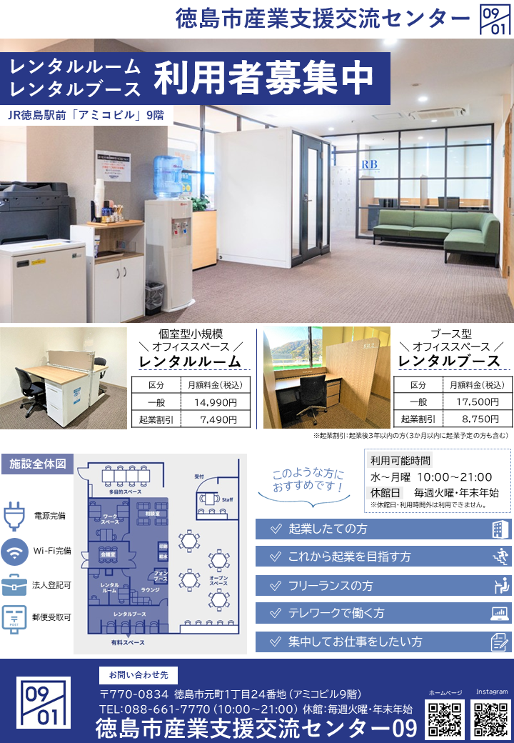 現在レンタルルーム・レンタルブースの利用者を募集しています。 利用を希望される方は、利用規約をご覧になり利用申請書を提出してください。先着順で受け付けます。