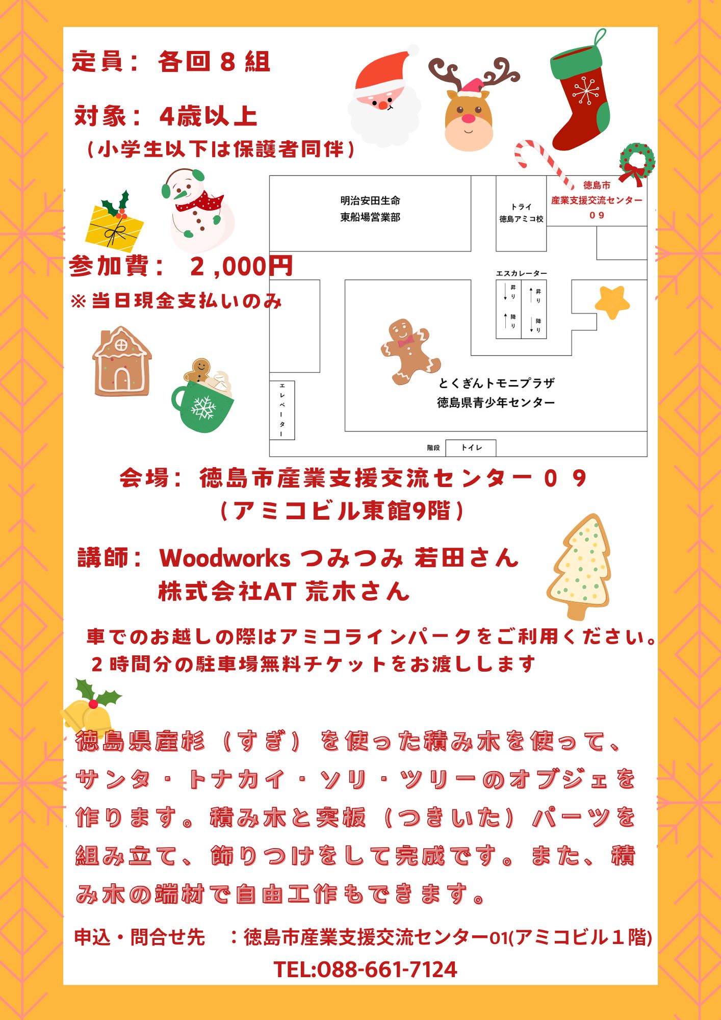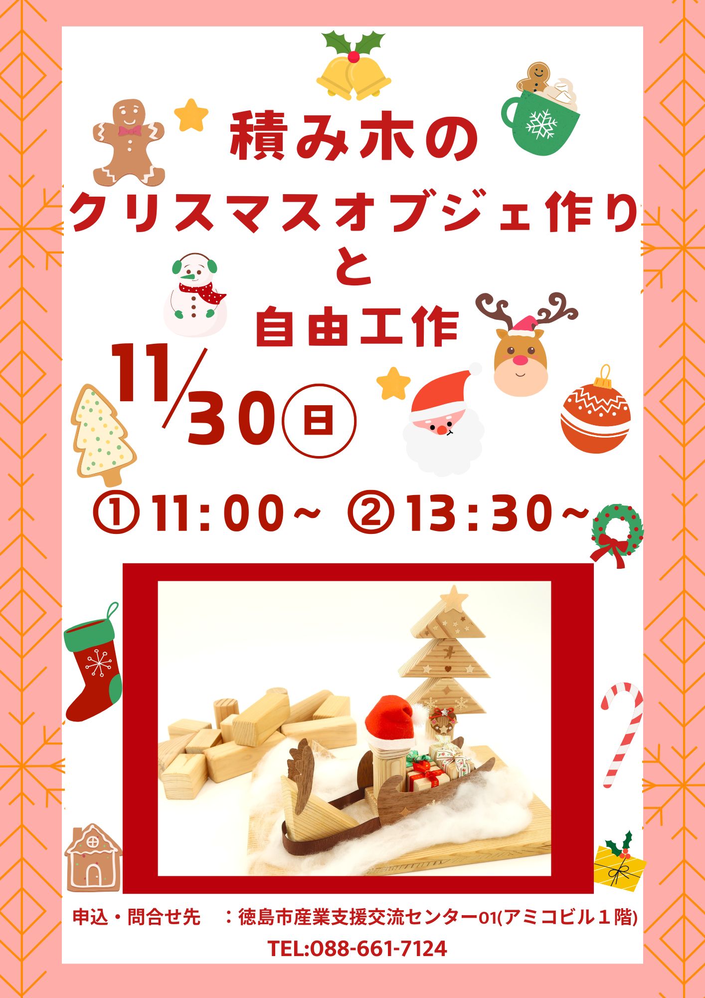 内容は「積み木のクリスマスオブジェ作りと自由工作」となります。